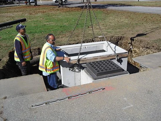 Tree filters utilize an “engineered” soil media to absorb and treat stormwater through a variety of physical, chemical, and biological processes, with combined high infiltration and water holding capacity. This balance allows for healthy tree growth and substantial rainwater runoff collection and treatment. The media filters pollutants such as phosphorus and nitrogen, which are generated from sources like dog waste and fertilizer, from stormwater runoff. The StormTree system consists of an open bottomed and open sided precast concrete frame which contains the media. Since the precast frame is open sided, it permits the filter media to expand beyond the footprint of the frame. This expansion allows for a greater filter area, and most importantly, ensures that tree roots are not confined or restricted. While the tree beautifies the neighborhood, it also benefits from greater quantities of water due to the stormwater collection. An attached catch basin or sump collects sands and sediments and provides ease of maintenance.